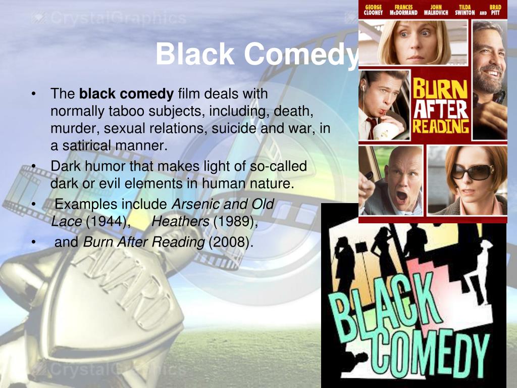 Black Comedy • The black comedy film deals with normally taboo subjects, including, death, murder, sexual relations, suicide and war, in a satirical manner. • Dark humor that makes light of so-called dark or evil elements in human nature. • Examples include Arsenic and Old Lace (1944),Heathers (1989), • and Burn After Reading (2008).