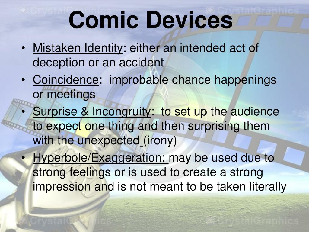Comic Devices • Mistaken Identity: either an intended act of deception or an accident • Coincidence: improbable chance happenings or meetings • Surprise & Incongruity: to set up the audience to expect one thing and then surprising them with the unexpected(irony) • Hyperbole/Exaggeration: may be used due to strong feelings or is used to create a strong impression and is not meant to be taken literally