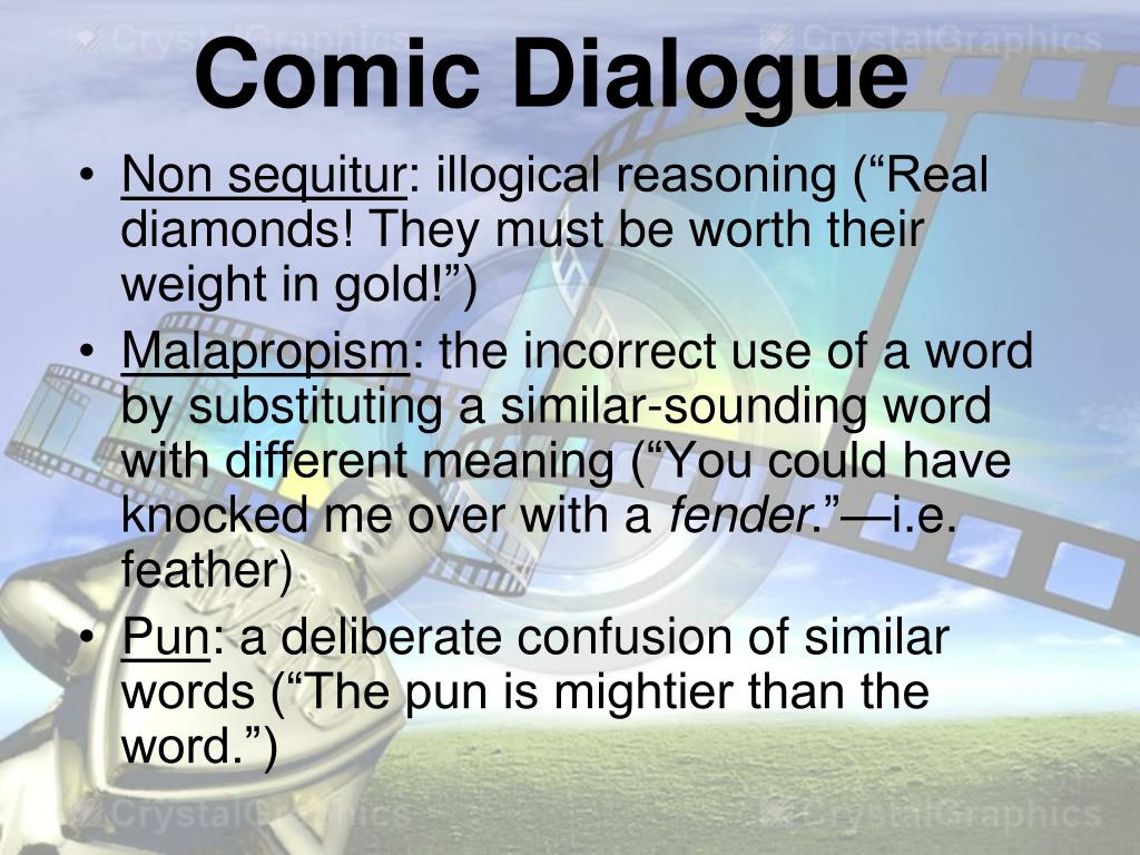 Comic Dialogue • Non sequitur: illogical reasoning (“Real diamonds! They must be worth their weight in gold!”) • Malapropism: the incorrect use of a word by substituting a similar-sounding word with different meaning (“You could have knocked me over with a fender.”—i.e. feather) • Pun: a deliberate confusion of similar words (“The pun is mightier than the word.”)