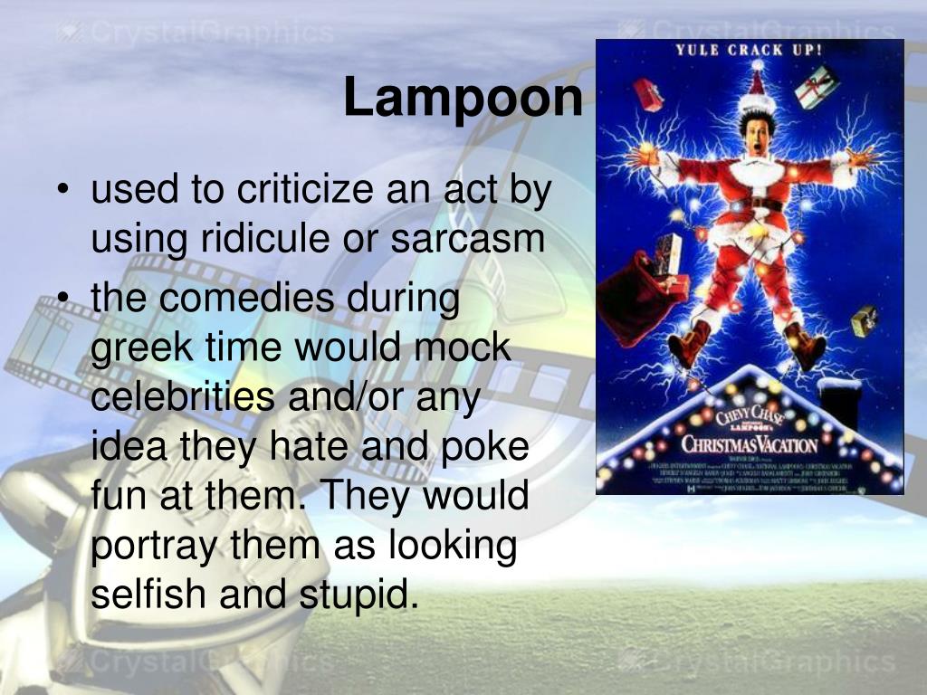 Lampoon • used to criticize an act by using ridicule or sarcasm • the comedies during greek time would mock celebrities and/or any idea they hate and poke fun at them. They would portray them as looking selfish and stupid.
