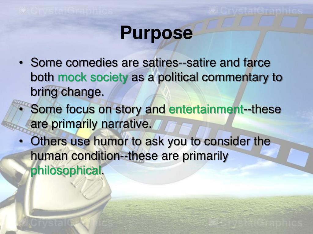 Purpose • Some comedies are satires--satire and farce both mock society as a political commentary to bring change. • Some focus on story and entertainment--these are primarily narrative. • Others use humor to ask you to consider the human condition--these are primarily philosophical.