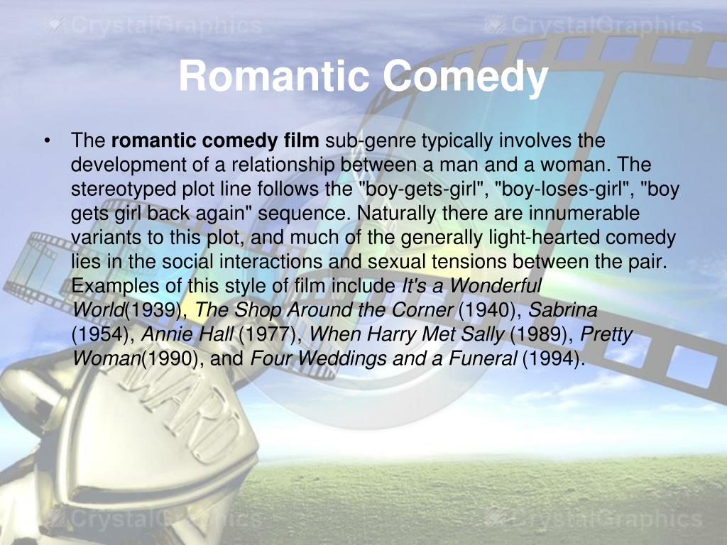 Romantic Comedy • The romantic comedy film sub-genre typically involves the development of a relationship between a man and a woman. The stereotyped plot line follows the "boy-gets-girl", "boy-loses-girl", "boy gets girl back again" sequence. Naturally there are innumerable variants to this plot, and much of the generally light-hearted comedy lies in the social interactions and sexual tensions between the pair. Examples of this style of film include It's a Wonderful World(1939), The Shop Around the Corner (1940), Sabrina (1954), Annie Hall (1977), When Harry Met Sally (1989), Pretty Woman(1990), and Four Weddings and a Funeral (1994).