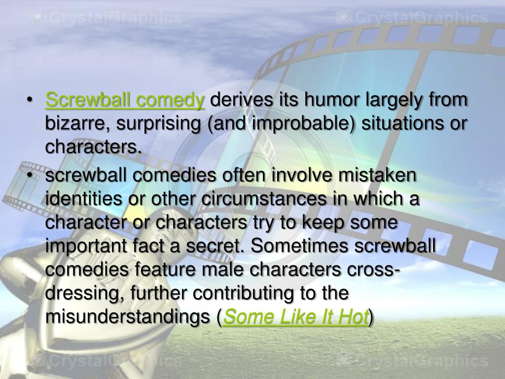 Screwball comedy derives its humor largely from bizarre, surprising (and improbable) situations or characters. • screwball comedies often involve mistaken identities or other circumstances in which a character or characters try to keep some important fact a secret. Sometimes screwball comedies feature male characters cross-dressing, further contributing to the misunderstandings (Some Like It Hot)