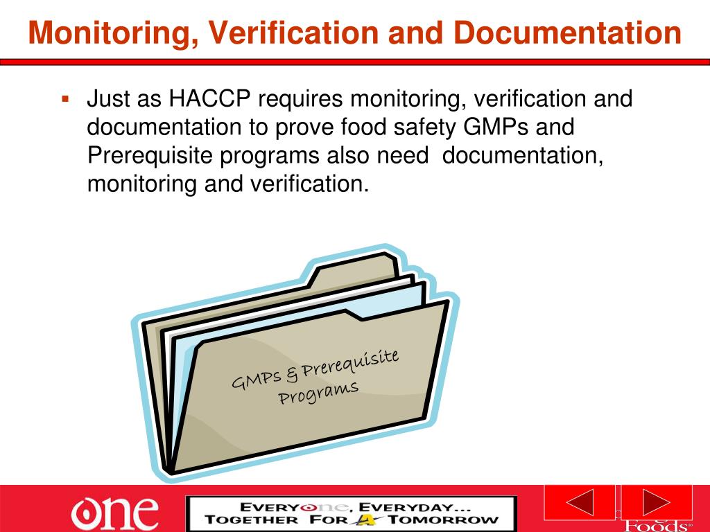 Monitoring, Verification and Documentation • Just as HACCP requires monitoring, verification and documentation to prove food safety GMPs and Prerequisite programs also need documentation, monitoring and verification. GMPs & Prerequisite Programs
