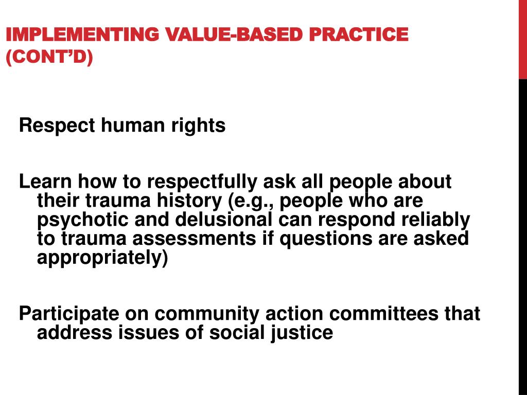 Implementing Value-Based Practice (cont’d) Respect human rights • Learn how to respectfully ask all people about their trauma history (e.g., people who are psychotic and delusional can respond reliably to trauma assessments if questions are asked appropriately) • Participate on community action committees that address issues of social justice