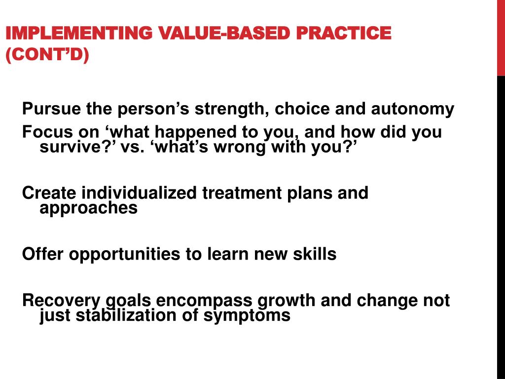 Implementing Value-Based Practice (cont’d) Pursue the person’s strength, choice and autonomy • Focus on ‘what happened to you, and how did you survive?’ vs. ‘what’s wrong with you?’ • Create individualized treatment plans and approaches • Offer opportunities to learn new skills • Recovery goals encompass growth and change not just stabilization of symptoms
