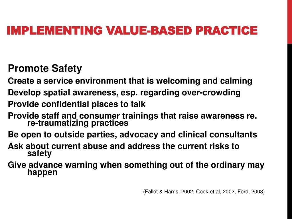 Implementing Value-Based Practice Promote Safety • Create a service environment that is welcoming and calming • Develop spatial awareness, esp. regarding over-crowding • Provide confidential places to talk • Provide staff and consumer trainings that raise awareness re. re-traumatizing practices • Be open to outside parties, advocacy and clinical consultants • Ask about current abuse and address the current risks to safety • Give advance warning when something out of the ordinary may happen (Fallot & Harris, 2002, Cook et al, 2002, Ford, 2003)
