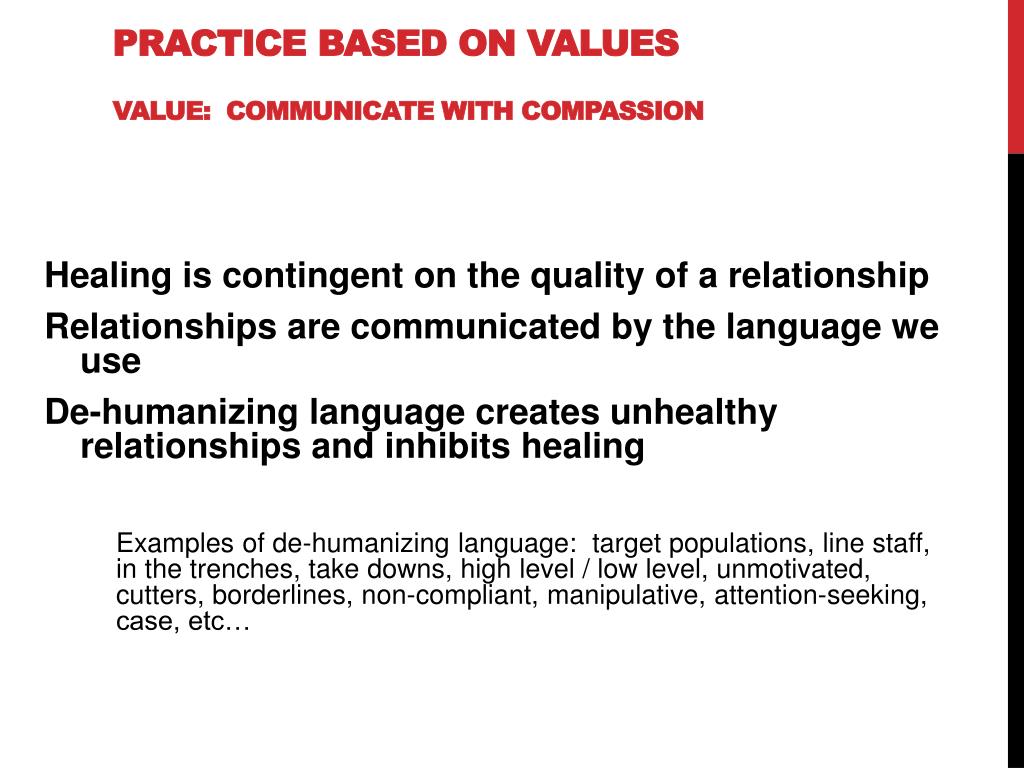 Practice Based on ValuesValue: Communicate with compassion • Healing is contingent on the quality of a relationship • Relationships are communicated by the language we use • De-humanizing language creates unhealthy relationships and inhibits healing Examples of de-humanizing language: target populations, line staff, in the trenches, take downs, high level / low level, unmotivated, cutters, borderlines, non-compliant, manipulative, attention-seeking, case, etc…