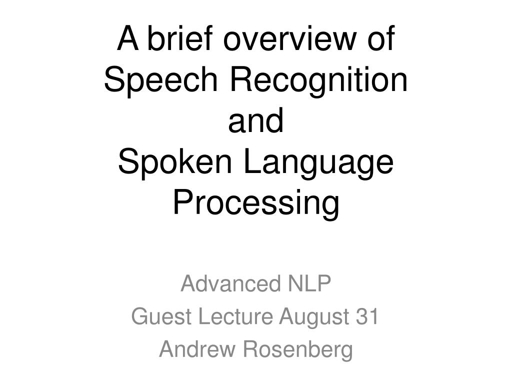 A brief overview of Speech Recognition and Spoken Language Processing. Advanced NLP Guest Lecture August 31 Andrew Rosenberg. Speech and NLP. Communication in Natural Language Text: Carefully prepared Grammatical Machine readable Typos Sometimes OCR or handwriting issues.