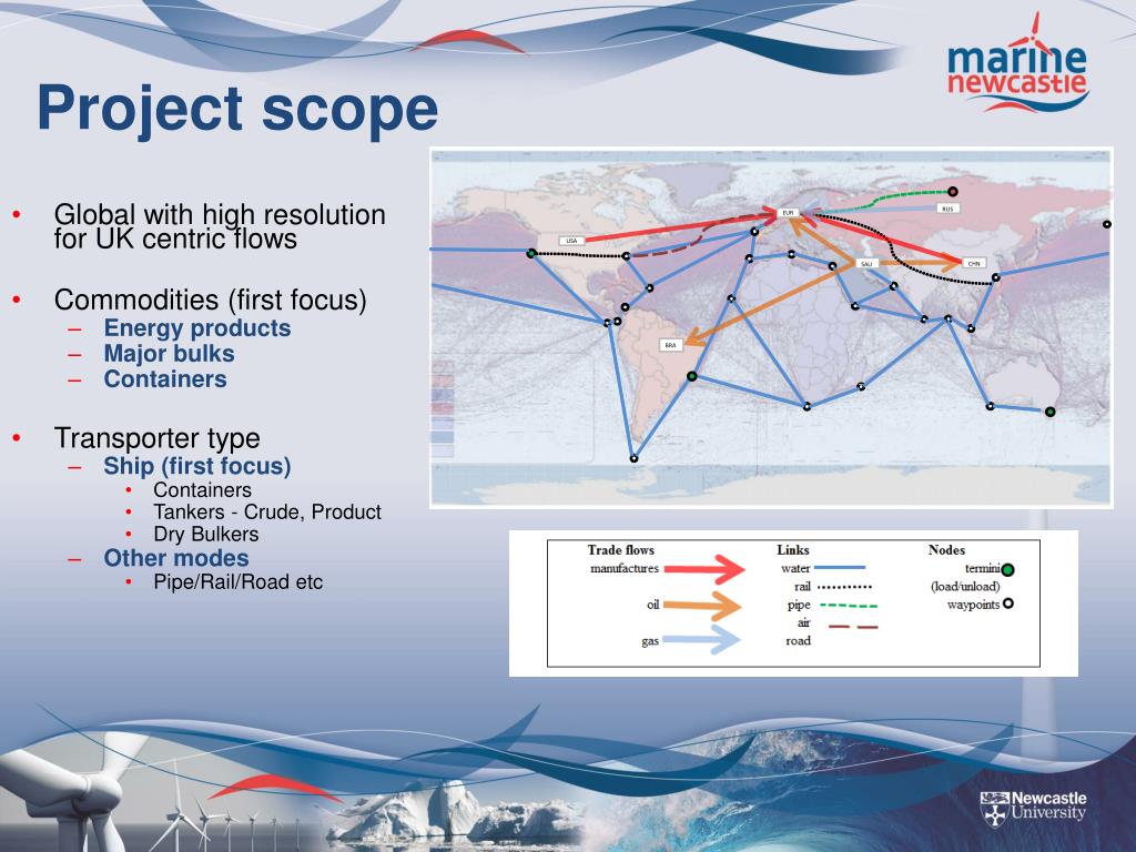 Project scope Global with high resolution for UK centric flows Commodities (first focus) Energy products Major bulks Containers Transporter type Ship (first focus) Containers Tankers - Crude, Product Dry Bulkers Other modes Pipe/Rail/Road etc