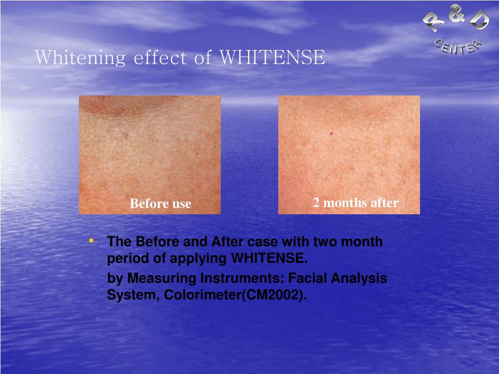 R & D CENTER Whitening effect of WHITENSE 2 months after Before use • The Before and After case with two month period of applying WHITENSE. • by Measuring Instruments: Facial Analysis System, Colorimeter(CM2002).