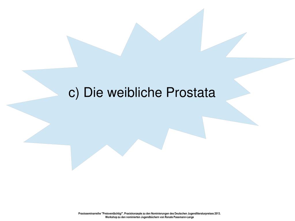 c) Die weibliche Prostata Praxisseminarreihe "Preisverdächtig!". Praxiskonzepte zu den Nominierungen des Deutschen Jugendliteraturpreises 2013. Workshop zu den nominierten Jugendbüchern von Renate Passmann-Lange