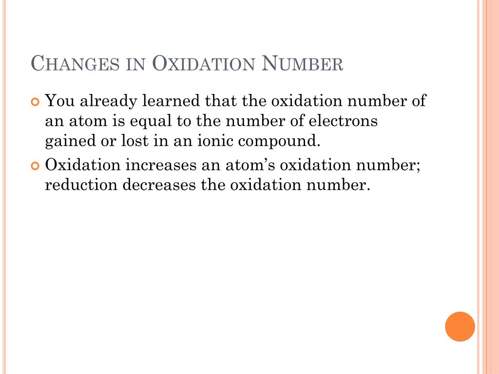 Changes in Oxidation Number • You already learned that the oxidation number of an atom is equal to the number of electrons gained or lost in an ionic compound. • Oxidation increases an atom’s oxidation number; reduction decreases the oxidation number.