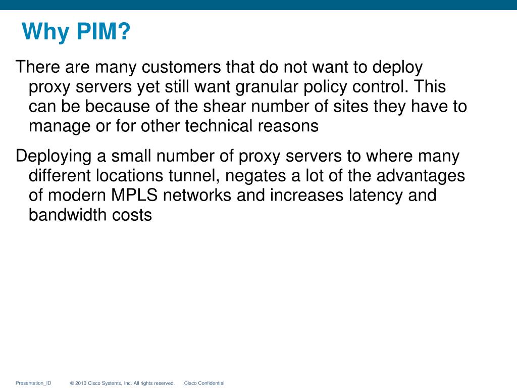Why PIM? There are many customers that do not want to deploy proxy servers yet still want granular policy control. This can be because of the shear number of sites they have to manage or for other technical reasons Deploying a small number of proxy servers to where many different locations tunnel, negates a lot of the advantages of modern MPLS networks and increases latency and bandwidth costs