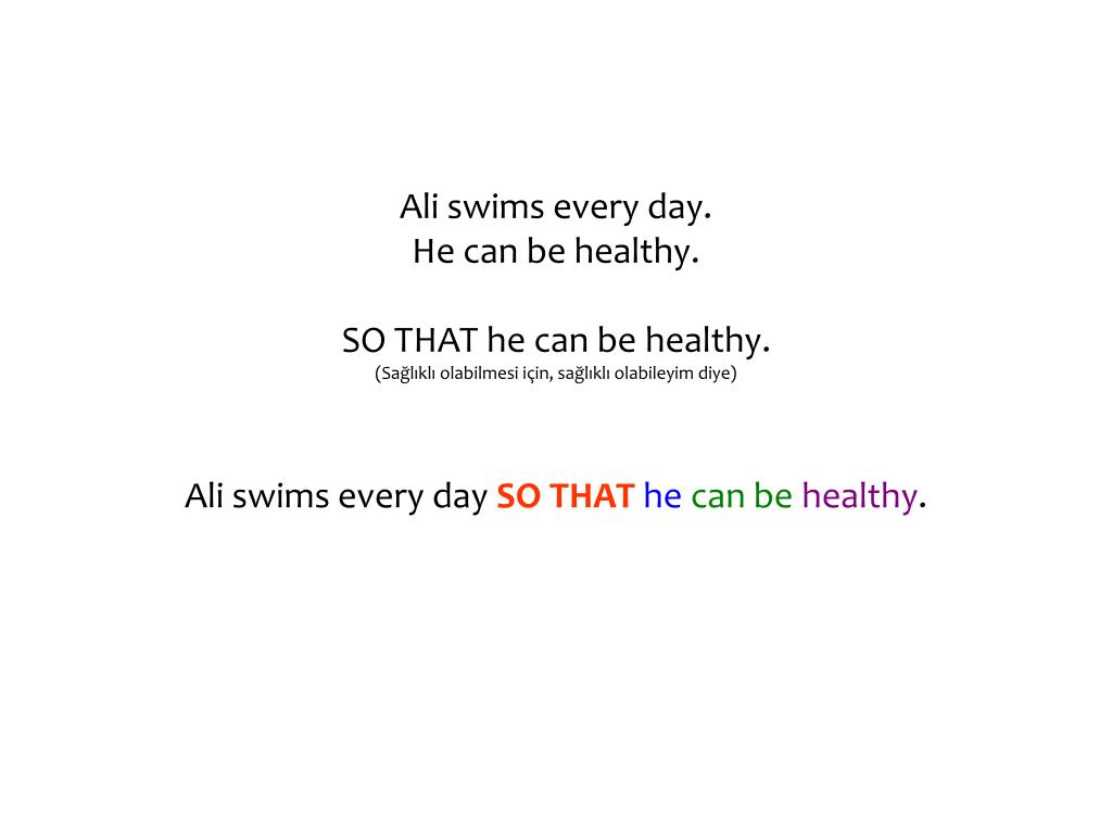 Ali swims every day. He can be healthy. SO THAT he can be healthy. (Sağlıklı olabilmesi için, sağlıklı olabileyim diye) Ali swims every day SO THAThecan behealthy.