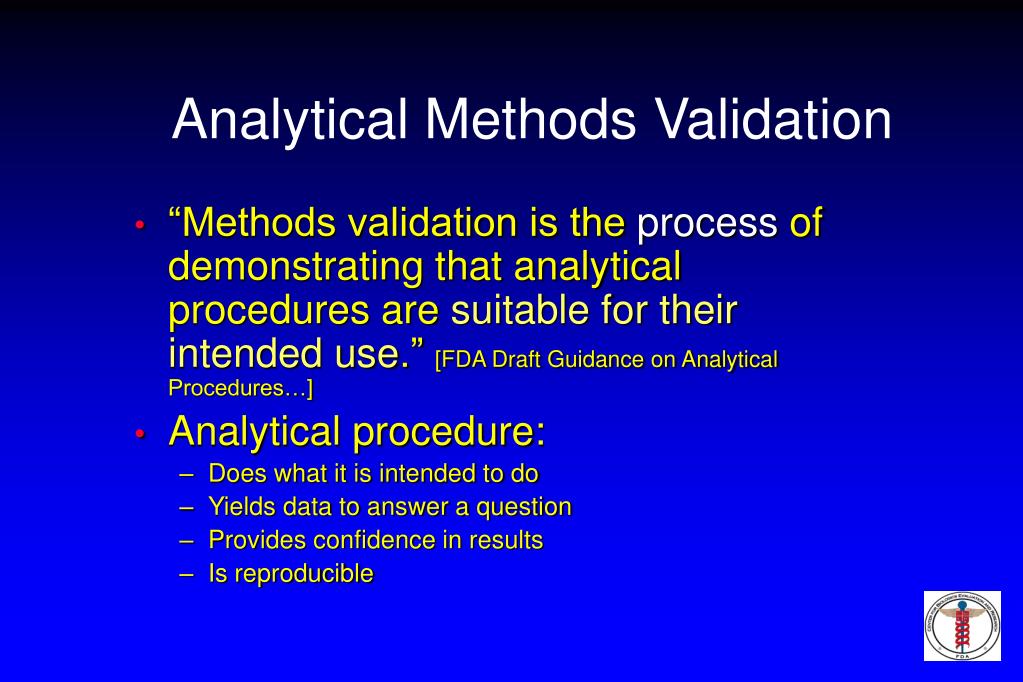 Analytical Methods Validation • “Methods validation is the process of demonstrating that analytical procedures are suitable for their intended use.” [FDA Draft Guidance on Analytical Procedures…] • Analytical procedure: • Does what it is intended to do • Yields data to answer a question • Provides confidence in results • Is reproducible