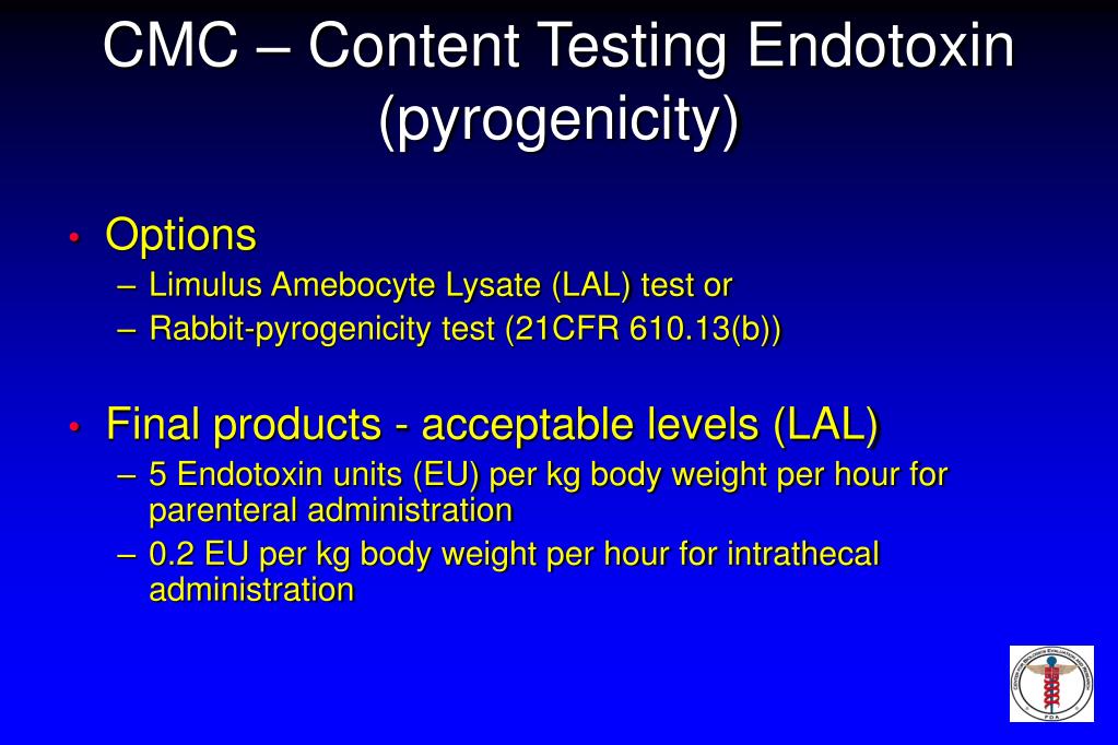 CMC – Content Testing Endotoxin (pyrogenicity) • Options • Limulus Amebocyte Lysate (LAL) test or • Rabbit-pyrogenicity test (21CFR 610.13(b)) • Final products - acceptable levels (LAL) • 5 Endotoxin units (EU) per kg body weight per hour for parenteral administration • 0.2 EU per kg body weight per hour for intrathecal administration