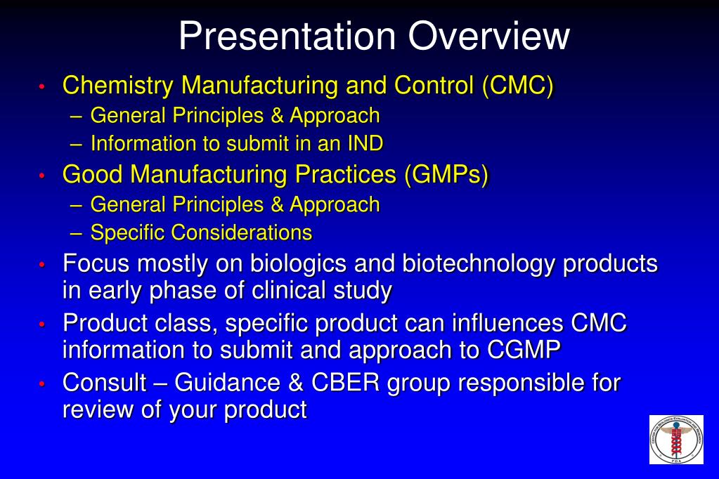 Presentation Overview • Chemistry Manufacturing and Control (CMC) • General Principles & Approach • Information to submit in an IND • Good Manufacturing Practices (GMPs) • General Principles & Approach • Specific Considerations • Focus mostly on biologics and biotechnology products in early phase of clinical study • Product class, specific product can influences CMC information to submit and approach to CGMP • Consult – Guidance & CBER group responsible for review of your product