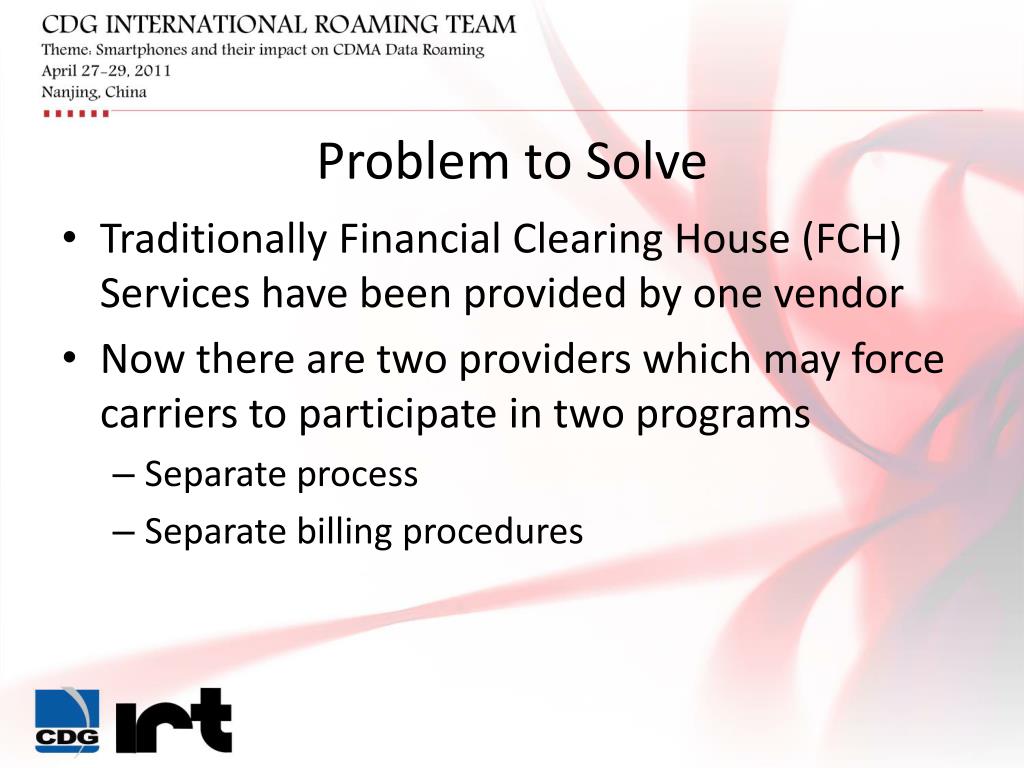Problem to Solve • Traditionally Financial Clearing House (FCH) Services have been provided by one vendor • Now there are two providers which may force carriers to participate in two programs • Separate process • Separate billing procedures