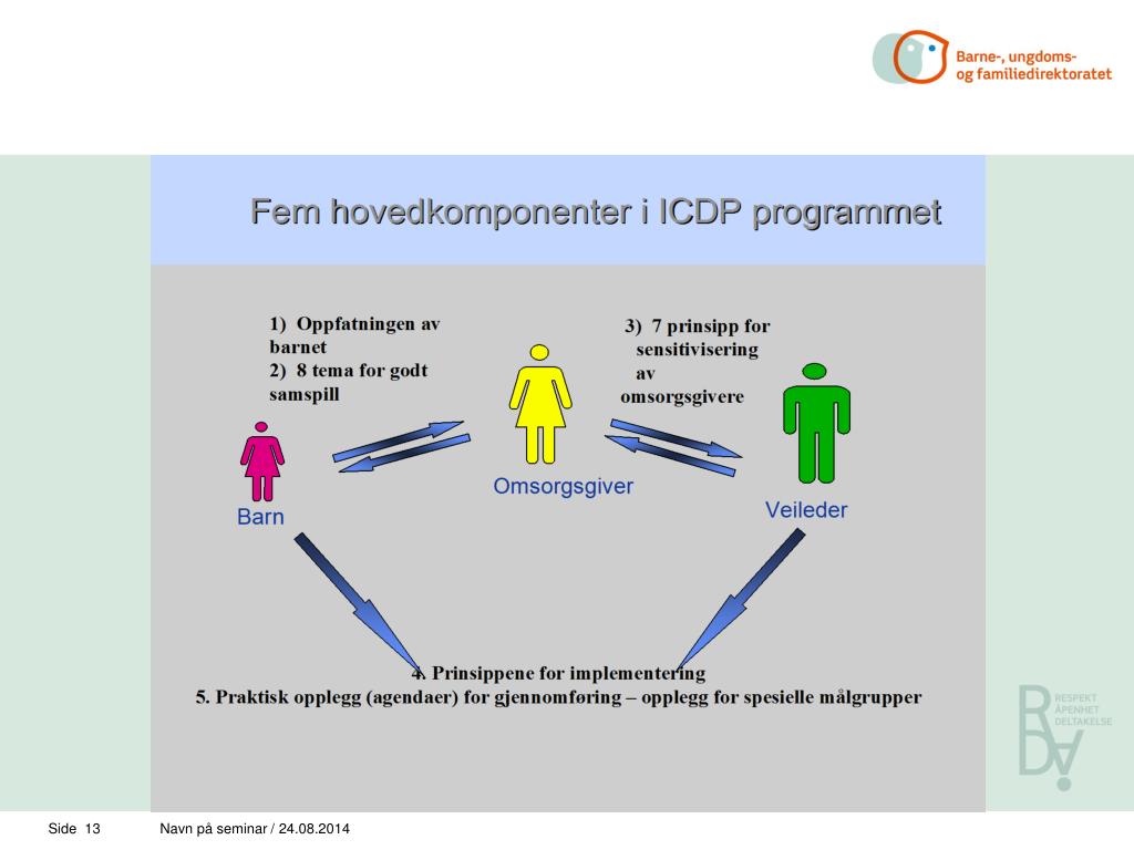 Teoretisk bakgrunn for ICDP-programmet • Nyere, kulturelt orientert utviklingspsykologi: • Barnet er født som sosialt vesen og kan kommunisere med andre fra fødselen av • Samspillet er en gjensidig prosess • Kvaliteten på samspillet og relasjonen mellom barnet og omsorgsgiveren er basis for barnets utvikling • Empatisk fortolkende holdning til barnet Navn på seminar / 24.08.2014