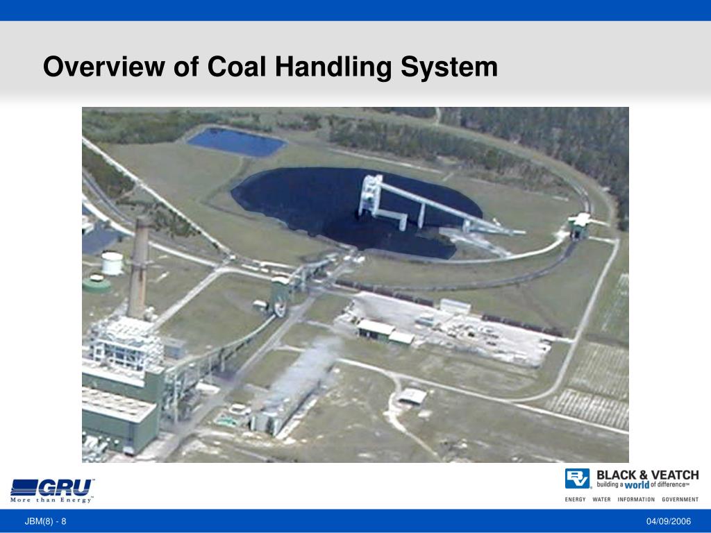Highlights of Coal Handling Operations • Coal Is Delivered by Unit Trains Carrying About 11,000 Tons • Unloaded From Track Hopper at 3,000 TPH • Conveyed to Dual Discharge Fixed Boom Stacker • Can Build 1,800 Ton Conical Coal Pile on North and South Sides JBM(8) - 10