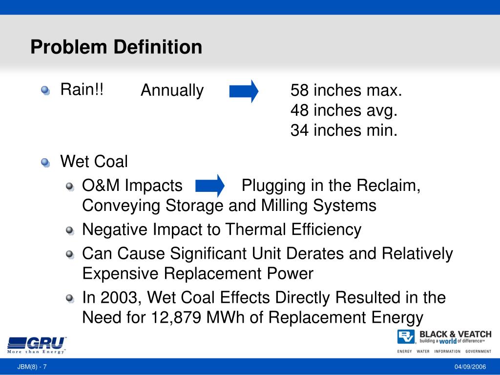 Problem Definition Annually 58 inches max. 48 inches avg. 34 inches min. • Rain!! • Wet Coal • O&M Impacts Plugging in the Reclaim, Conveying Storage and Milling Systems • Negative Impact to Thermal Efficiency • Can Cause Significant Unit Derates and Relatively Expensive Replacement Power • In 2003, Wet Coal Effects Directly Resulted in the Need for 12,879 MWh of Replacement Energy JBM(8) - 7