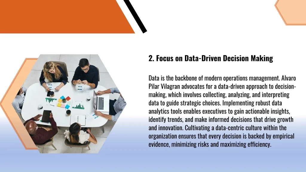 2. Focus on Data-Driven Decision Making Data is the backbone of modern operations management. Alvaro Pilar Vilagran advocates for a data-driven approach to decision-making, which involves collecting, analyzing, and interpreting data to guide strategic choices. Implementing robust data analytics tools enables executives to gain actionable insights, identify trends, and make informed decisions that drive growth and innovation. Cultivating a data-centric culture within the organization ensures that every decision is backed by empirical evidence, minimizing risks and maximizing efficiency.