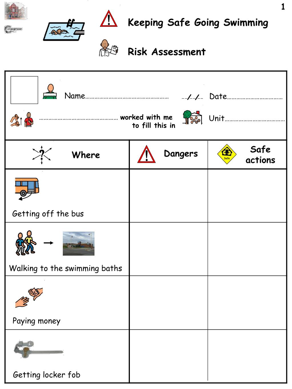 1 Keeping Safe Going Swimming Risk Assessment Name……………………………………………… Date……………………………… …………………………………………… worked with me to fill this in Unit………………………………… Safe actions Dangers Where Getting off the bus Walking to the swimming baths Paying money Getting locker fob
