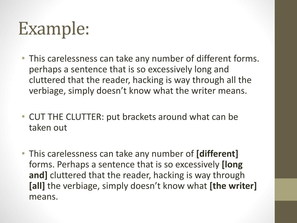 Example: • This carelessness can take any number of different forms. perhaps a sentence that is so excessively long and cluttered that the reader, hacking is way through all the verbiage, simply doesn’t know what the writer means. • CUT THE CLUTTER: put brackets around what can be taken out • This carelessness can take any number of [different] forms. Perhaps a sentence that is so excessively [long and] cluttered that the reader, hacking is way through [all] the verbiage, simply doesn’t know what [the writer] means.