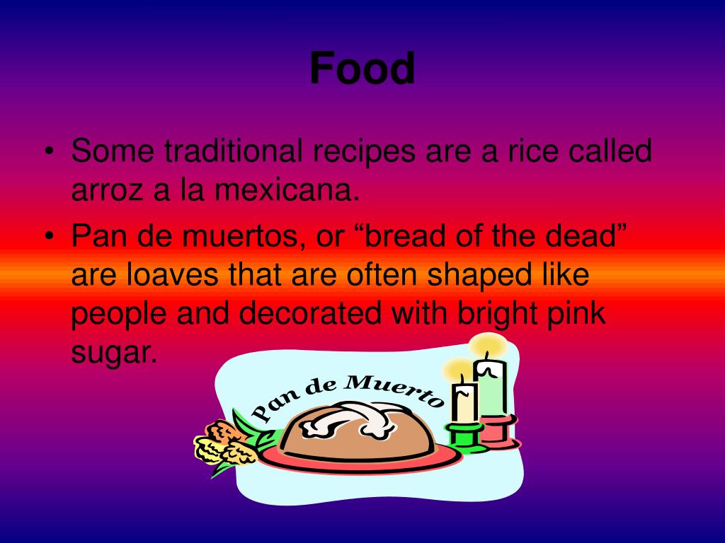 Food • Some traditional recipes are a rice called arroz a la mexicana. • Pan de muertos, or “bread of the dead” are loaves that are often shaped like people and decorated with bright pink sugar.