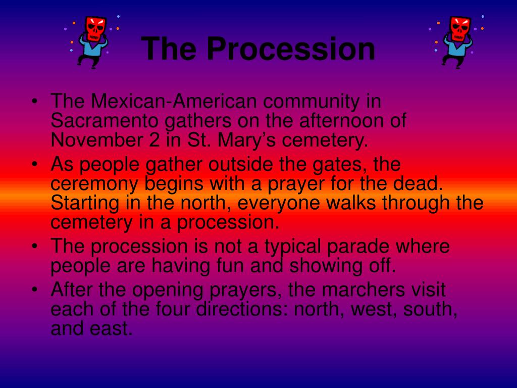 The Procession • The Mexican-American community in Sacramento gathers on the afternoon of November 2 in St. Mary’s cemetery. • As people gather outside the gates, the ceremony begins with a prayer for the dead. Starting in the north, everyone walks through the cemetery in a procession. • The procession is not a typical parade where people are having fun and showing off. • After the opening prayers, the marchers visit each of the four directions: north, west, south, and east.