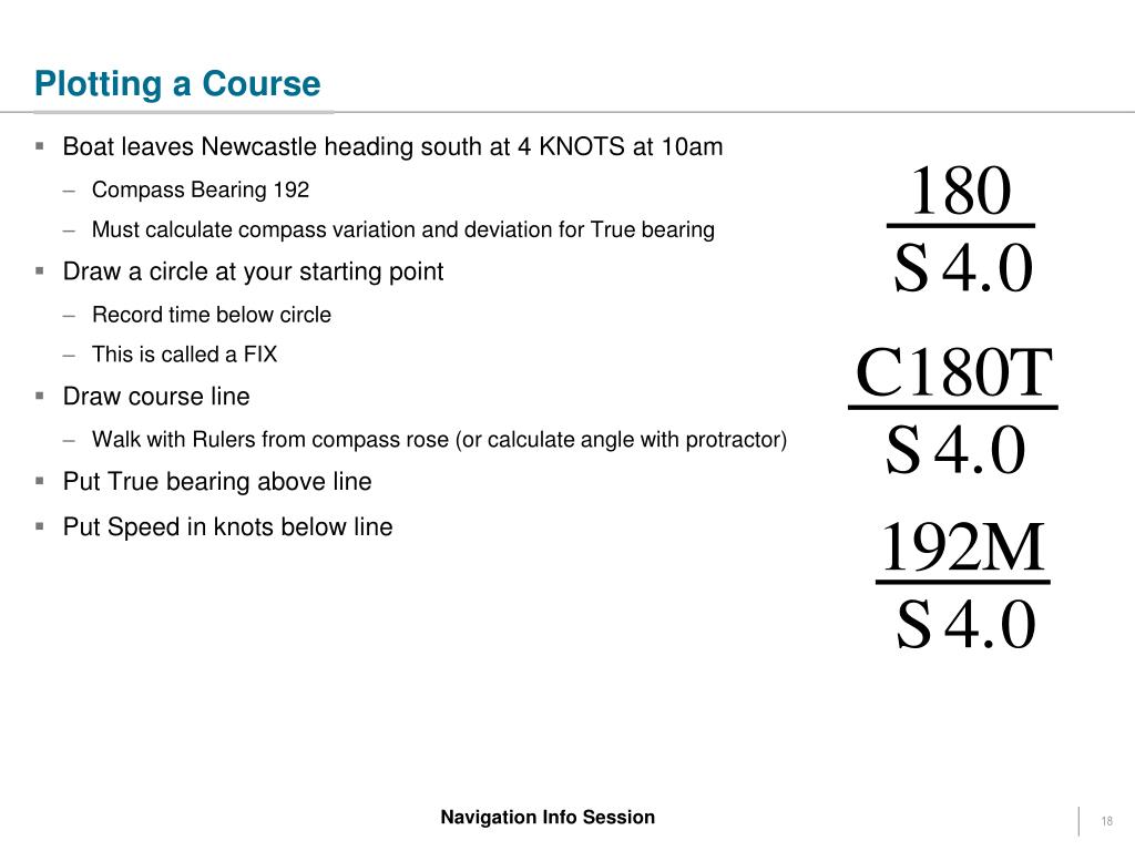 Plotting a Course • Boat leaves Newcastle heading south at 4 KNOTS at 10am • Compass Bearing 192 • Must calculate compass variation and deviation for True bearing • Draw a circle at your starting point • Record time below circle • This is called a FIX • Draw course line • Walk with Rulers from compass rose (or calculate angle with protractor) • Put True bearing above line • Put Speed in knots below line