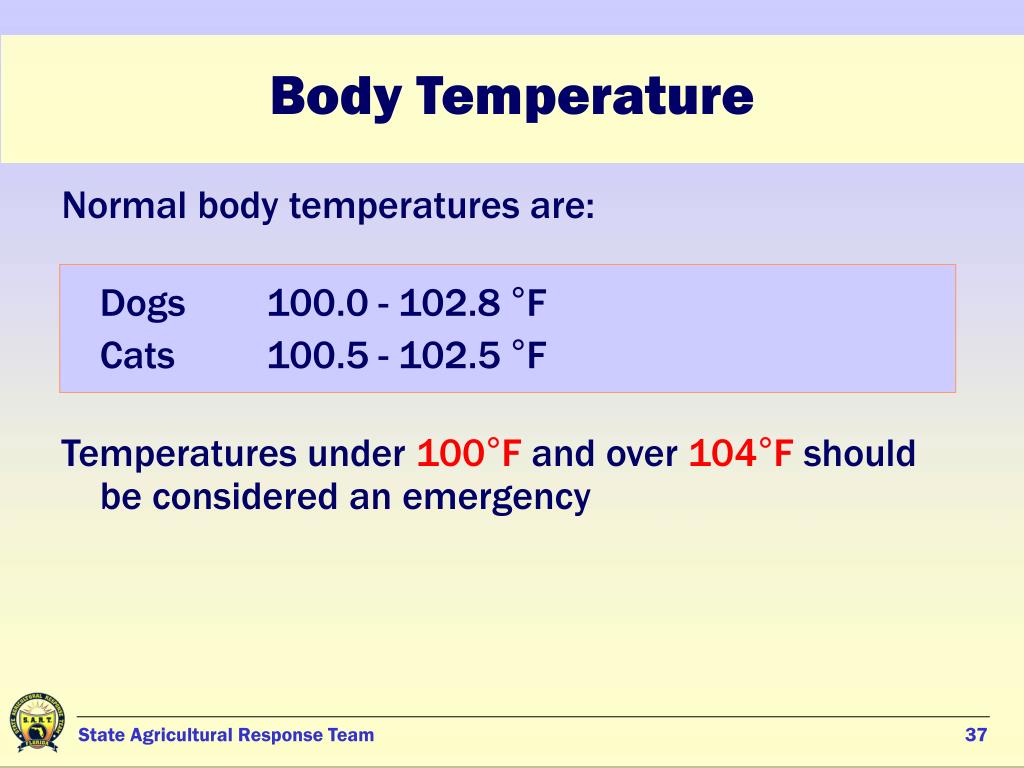 Body Temperature Normal body temperatures are: Dogs 100.0 - 102.8 °F Cats 100.5 - 102.5 °F Temperatures under 100°F and over 104°F should be considered an emergency State Agricultural Response Team