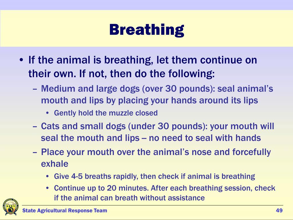Breathing • If the animal is breathing, let them continue on their own. If not, then do the following: • Medium and large dogs (over 30 pounds): seal animal’s mouth and lips by placing your hands around its lips • Gently hold the muzzle closed • Cats and small dogs (under 30 pounds): your mouth will seal the mouth and lips -- no need to seal with hands • Place your mouth over the animal’s nose and forcefully exhale • Give 4-5 breaths rapidly, then check if animal is breathing • Continue up to 20 minutes. After each breathing session, check if the animal can breath without assistance State Agricultural Response Team