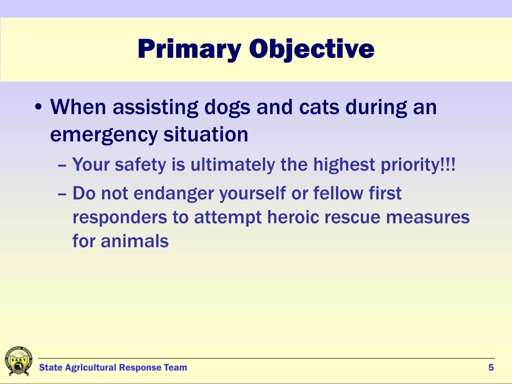Primary Objective • When assisting dogs and cats during an emergency situation • Your safety is ultimately the highest priority!!! • Do not endanger yourself or fellow first responders to attempt heroic rescue measures for animals State Agricultural Response Team