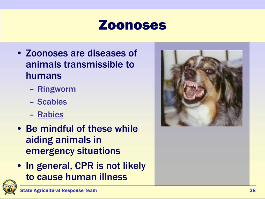 Zoonoses • Zoonoses are diseases of animals transmissible to humans • Ringworm • Scabies • Rabies • Be mindful of these while aiding animals in emergency situations • In general, CPR is not likely to cause human illness State Agricultural Response Team