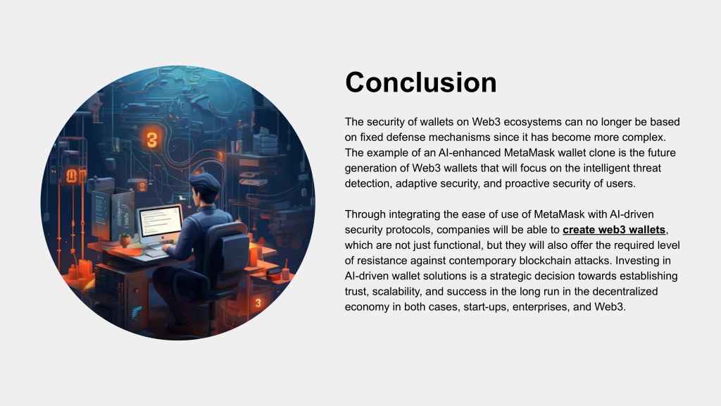Conclusion The security of wallets on Web3 ecosystems can no longer be based on fixed defense mechanisms since it has become more complex. The example of an AI-enhanced MetaMask wallet clone is the future generation of Web3 wallets that will focus on the intelligent threat detection, adaptive security, and proactive security of users. Through integrating the ease of use of MetaMask with AI-driven security protocols, companies will be able to create web3 wallets, which are not just functional, but they will also offer the required level of resistance against contemporary blockchain attacks. Investing in AI-driven wallet solutions is a strategic decision towards establishing trust, scalability, and success in the long run in the decentralized economy in both cases, start-ups, enterprises, and Web3.