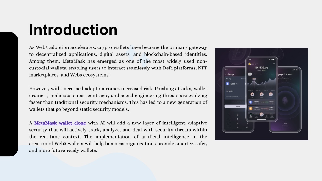 Introduction As Web3 adoption accelerates, crypto wallets have become the primary gateway to decentralized applications, digital assets, and blockchain-based identities. Among them, MetaMask has emerged as one of the most widely used non- custodial wallets, enabling users to interact seamlessly with DeFi platforms, NFT marketplaces, and Web3 ecosystems. However, with increased adoption comes increased risk. Phishing attacks, wallet drainers, malicious smart contracts, and social engineering threats are evolving faster than traditional security mechanisms. This has led to a new generation of wallets that go beyond static security models. A MetaMask wallet clone with AI will add a new layer of intelligent, adaptive security that will actively track, analyze, and deal with security threats within the real-time context. The implementation of artificial intelligence in the creation of Web3 wallets will help business organizations provide smarter, safer, and more future-ready wallets.
