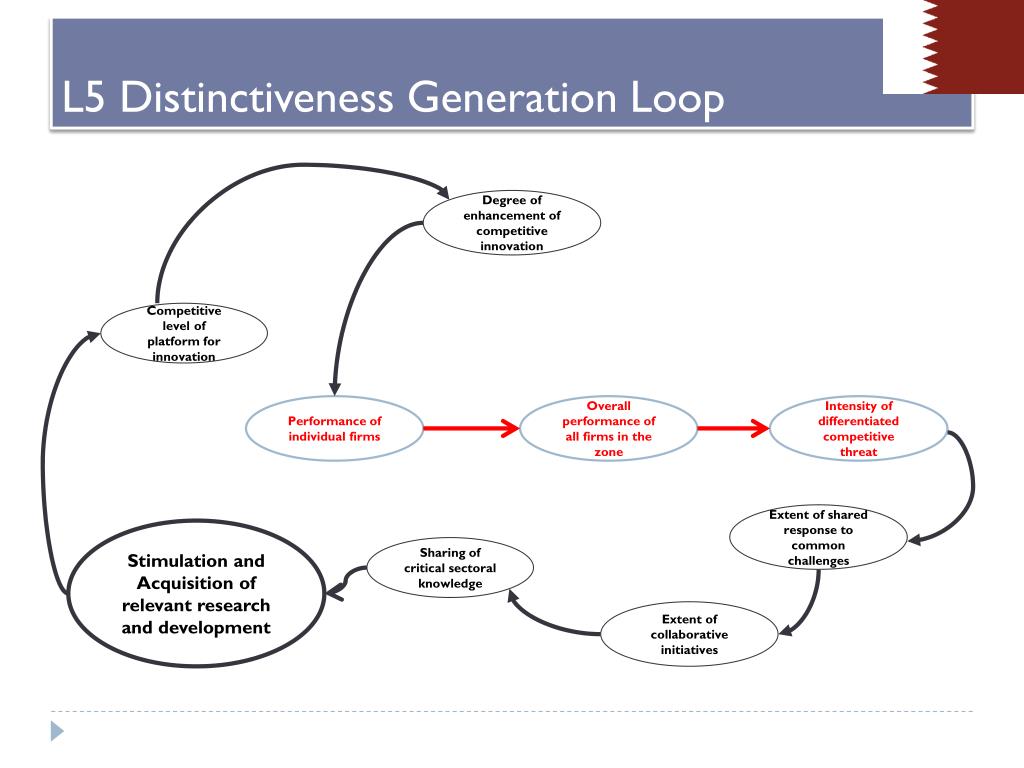 Degree of enhancement of competitive innovation Competitive level of platform for innovation Performance of individual firms Overall performance of all firms in the zone Intensity of differentiated competitive threat Extent of shared response to common challenges Sharing of critical sectoral knowledge Extent of collaborative initiatives L5 Distinctiveness Generation Loop Stimulation and Acquisition of relevant research and development