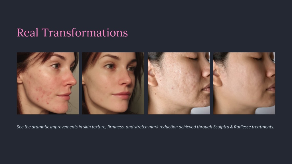 Real Transformations See the dramatic improvements in skin texture, firmness, and stretch mark reduction achieved through Sculptra & Radiesse treatments.