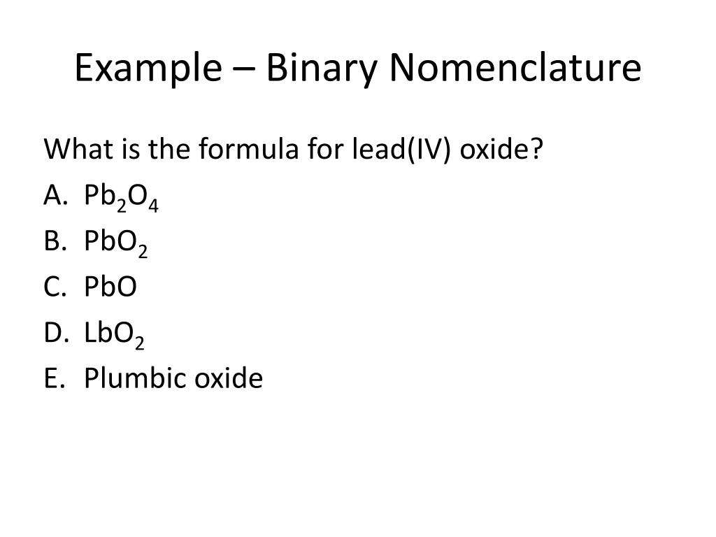 Example – Binary Nomenclature What is the formula for lead(IV) oxide? • Pb2O4 • PbO2 • PbO • LbO2 • Plumbic oxide
