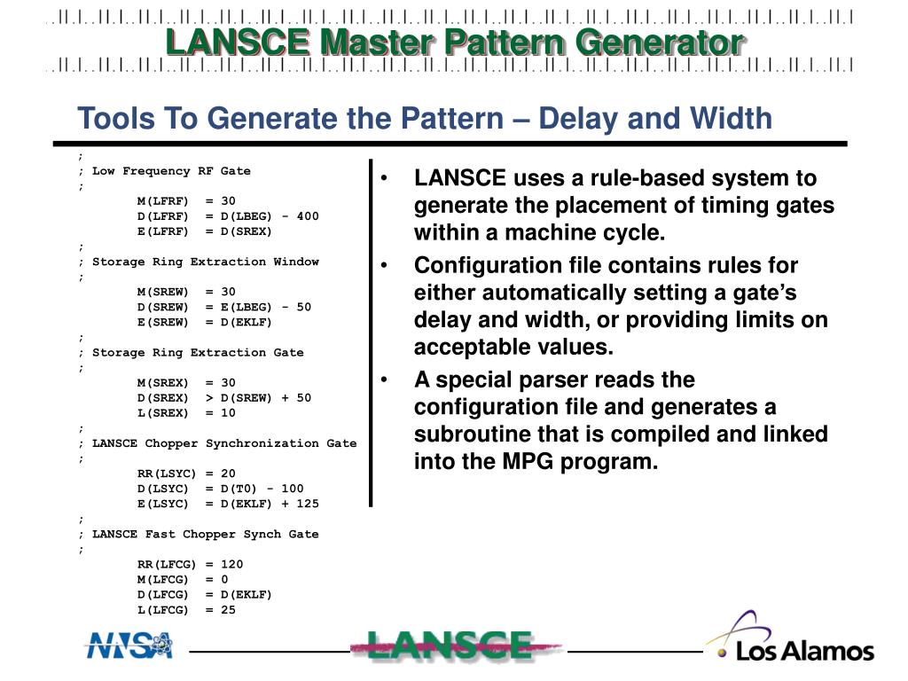 Tools To Generate the Pattern – Delay and Width ; ; Low Frequency RF Gate ; M(LFRF) = 30 D(LFRF) = D(LBEG) - 400 E(LFRF) = D(SREX) ; ; Storage Ring Extraction Window ; M(SREW) = 30 D(SREW) = E(LBEG) - 50 E(SREW) = D(EKLF) ; ; Storage Ring Extraction Gate ; M(SREX) = 30 D(SREX) > D(SREW) + 50 L(SREX) = 10 ; ; LANSCE Chopper Synchronization Gate ; RR(LSYC) = 20 D(LSYC) = D(T0) - 100 E(LSYC) = D(EKLF) + 125 ; ; LANSCE Fast Chopper Synch Gate ; RR(LFCG) = 120 M(LFCG) = 0 D(LFCG) = D(EKLF) L(LFCG) = 25 • LANSCE uses a rule-based system to generate the placement of timing gates within a machine cycle. • Configuration file contains rules for either automatically setting a gate’s delay and width, or providing limits on acceptable values. • A special parser reads the configuration file and generates a subroutine that is compiled and linked into the MPG program.