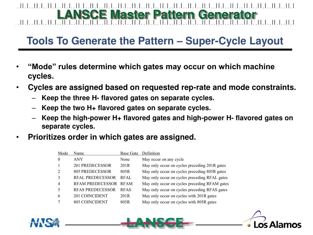 Tools To Generate the Pattern – Super-Cycle Layout • “Mode” rules determine which gates may occur on which machine cycles. • Cycles are assigned based on requested rep-rate and mode constraints. • Keep the three H- flavored gates on separate cycles. • Keep the two H+ flavored gates on separate cycles. • Keep the high-power H+ flavored gates and high-power H- flavored gates on separate cycles. • Prioritizes order in which gates are assigned. Mode Name Base Gate Definition 0 ANY None May occur on any cycle 1 201 PREDECESSOR 201R May only occur on cycles preceding 201R gates 2 805 PREDECESSOR 805R May only occur on cycles preceding 805R gates 3 RFAL PREDECESSOR RFAL May only occur on cycles preceding RFAL gates 4 RFAM PREDECESSOR RFAM May only occur on cycles preceding RFAM gates 5 RFAS PREDECESSOR RFAS May only occur on cycles preceding RFAS gates 6 201 COINCIDENT 201R May only occur on cycles with 201R gates 7 805 COINCIDENT 805R May only occur on cycles with 805R gates