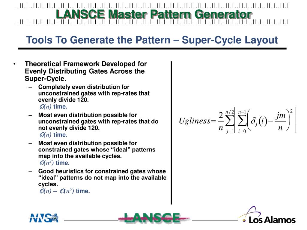 Tools To Generate the Pattern – Super-Cycle Layout • Theoretical Framework Developed for Evenly Distributing Gates Across the Super-Cycle. • Completely even distribution for unconstrained gates with rep-rates that evenly divide 120.O(n) time. • Most even distribution possible for unconstrained gates with rep-rates that do not evenly divide 120.O(n) time. • Most even distribution possible for constrained gates whose “ideal” patterns map into the available cycles.O(n2) time. • Good heuristics for constrained gates whose “ideal” patterns do not map into the available cycles.O(n) – O(n5) time.