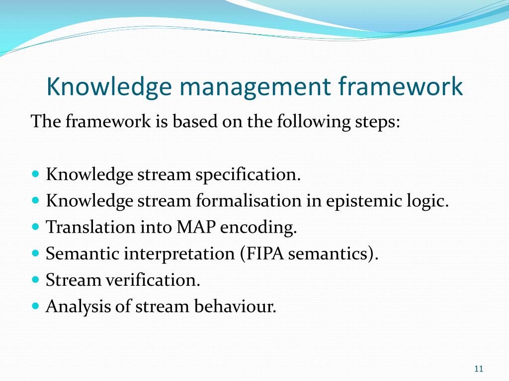 Knowledge management framework The framework is based on the following steps: • Knowledge stream specification. • Knowledge stream formalisation in epistemic logic. • Translation into MAP encoding. • Semantic interpretation (FIPA semantics). • Stream verification. • Analysis of stream behaviour.