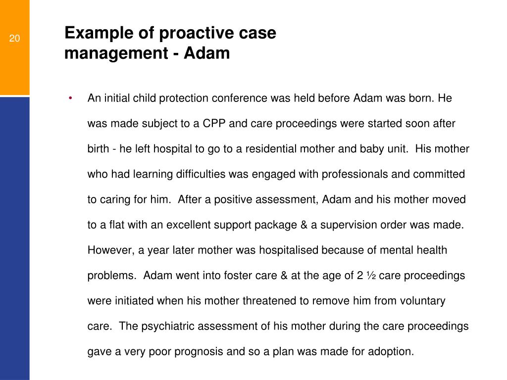 Example of proactive case management - Adam • An initial child protection conference was held before Adam was born. He was made subject to a CPP and care proceedings were started soon after birth - he left hospital to go to a residential mother and baby unit. His mother who had learning difficulties was engaged with professionals and committed to caring for him. After a positive assessment, Adam and his mother moved to a flat with an excellent support package & a supervision order was made. However, a year later mother was hospitalised because of mental health problems. Adam went into foster care & at the age of 2 ½ care proceedings were initiated when his mother threatened to remove him from voluntary care. The psychiatric assessment of his mother during the care proceedings gave a very poor prognosis and so a plan was made for adoption.