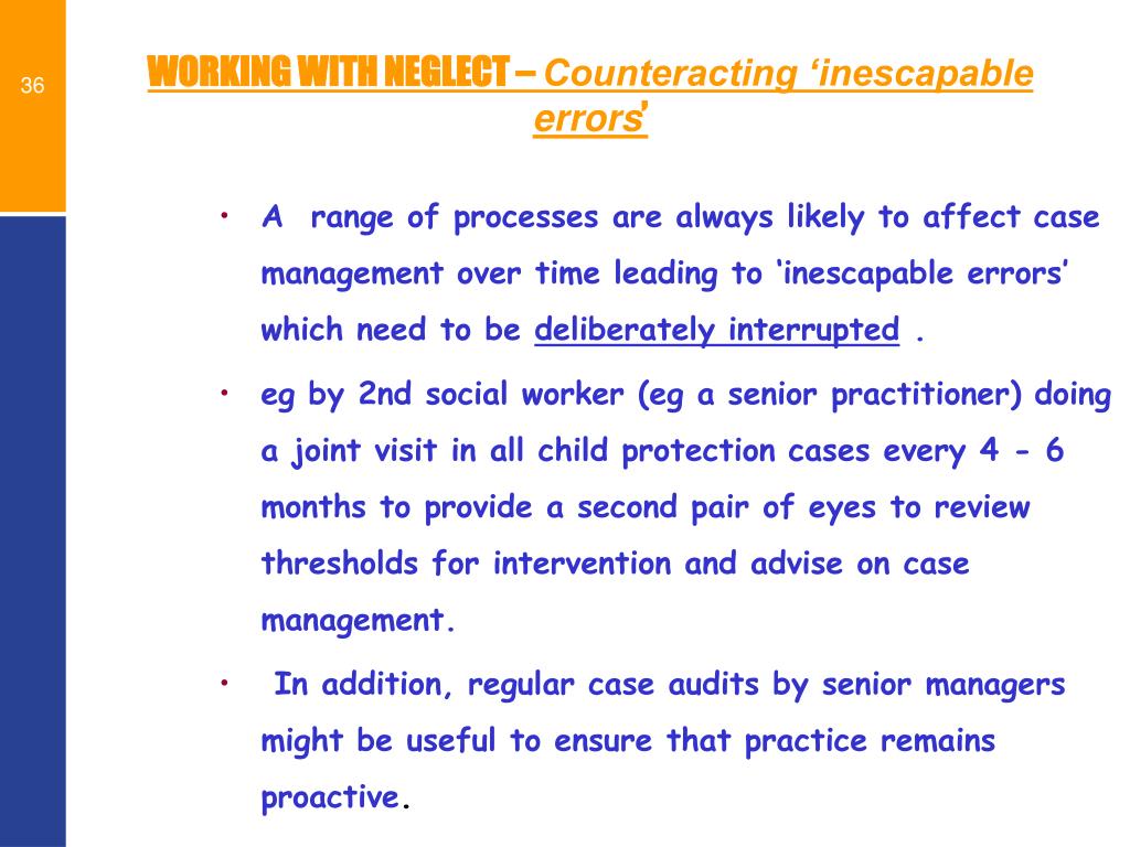 A range of processes are always likely to affect case management over time leading to ‘inescapable errors’ which need to be deliberately interrupted . eg by 2nd social worker (eg a senior practitioner) doing a joint visit in all child protection cases every 4 - 6 months to provide a second pair of eyes to review thresholds for intervention and advise on case management. In addition, regular case audits by senior managers might be useful to ensure that practice remains proactive. WORKING WITH NEGLECT – Counteracting ‘inescapable errors’