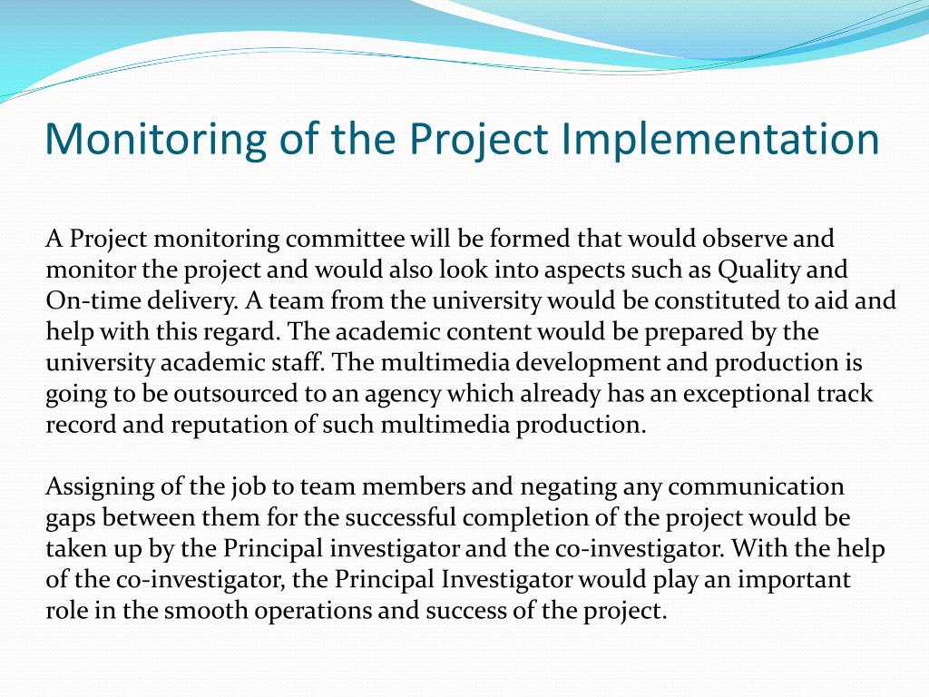 Monitoring of the Project Implementation A Project monitoring committee will be formed that would observe and monitor the project and would also look into aspects such as Quality and On-time delivery. A team from the university would be constituted to aid and help with this regard. The academic content would be prepared by the university academic staff. The multimedia development and production is going to be outsourced to an agency which already has an exceptional track record and reputation of such multimedia production. Assigning of the job to team members and negating any communication gaps between them for the successful completion of the project would be taken up by the Principal investigator and the co-investigator. With the help of the co-investigator, the Principal Investigator would play an important role in the smooth operations and success of the project.