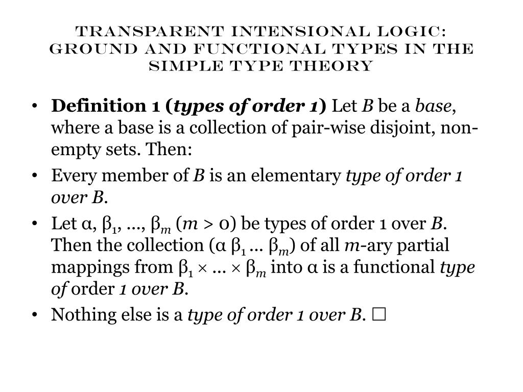 TRANSPARENT INTENSIONAL LOGIC:GROUND AND FUNCTIONAL TYPES IN THE SIMPLE TYPE THEORY • Definition 1 (types of order 1) Let B be a base, where a base is a collection of pair-wise disjoint, non-empty sets. Then: • Every member of B is an elementary type of order 1 over B. • Let α, β1, ..., βm(m > 0) be types of order 1 over B. Then the collection(α β1 ... βm) of all m-ary partial mappings from β1 ... βminto α is a functional type of order 1 over B. • Nothing else is a type of order 1 over B.