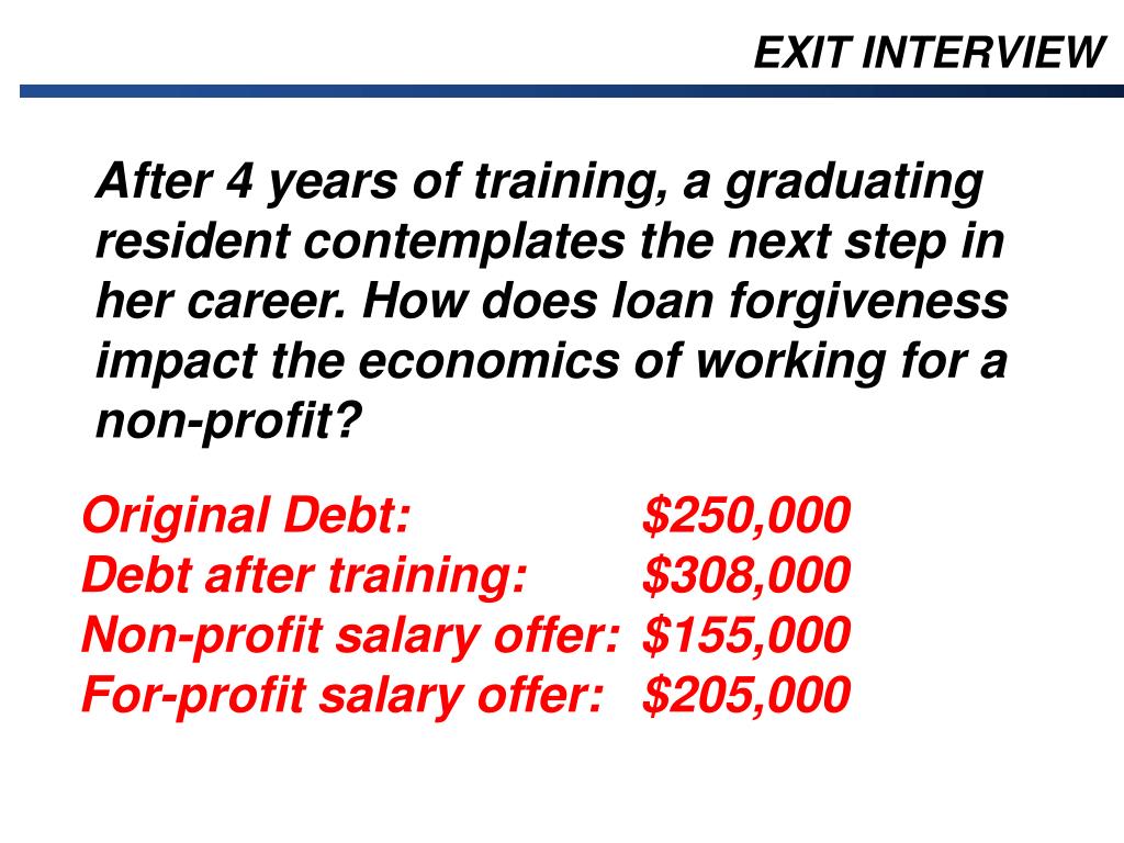 EXIT INTERVIEW After 4 years of training, a graduating resident contemplates the next step in her career. How does loan forgiveness impact the economics of working for a non-profit? Original Debt: $250,000 Debt after training: $308,000 Non-profit salary offer: $155,000 For-profit salary offer: $205,000